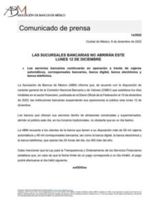 El próximo lunes 12 de diciembre de 2022, será día inhábil para las entidades financieras sujetas a la supervisión de la #CNBV.